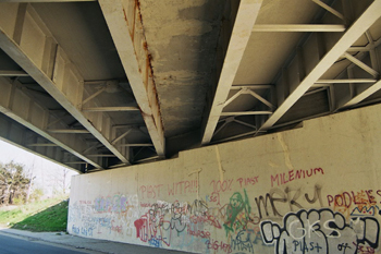Die vierstreifige Hauptstraße verläuft über zwei weit auseinander liegende Brückenbauwerke jüngerer Zeit